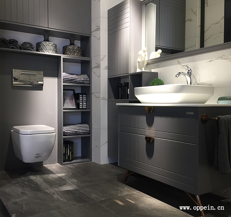 如图所示,面盆台面选用与墙面相同色彩的灰色,调配起来的作用是比较调和漂亮的。而灰色是个很中性的色彩,既不会太“黑”让空间压抑,也不会“白”得不耐脏,灰色让空间看起来精约大方,又便利清洁呢。